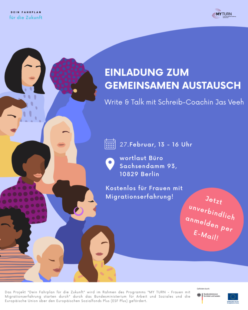 Lass deine Stimme sprechen. Vernetze dich mit anderen Frauen. Zeig uns deine Geschichte, deinen mutigen Weg hier in Deutschland. Du musst keine Erfahrung mit Schreiben mitbringen und kannst natürlich auch in deiner Muttersprache schreiben.