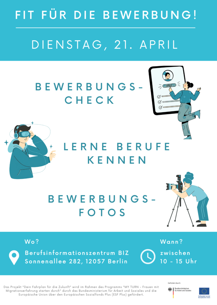 Das Projekt „Dein Fahrplan für die Zukunft“ wird im Rahmen des Programms „MY TURN – Frauen mit Migrationserfahrung starten durch” durch das Bundesministerium für Arbeit und Soziales und die Europäische Union über den Europäischen Sozialfonds Plus (ESF Plus) gefördert.