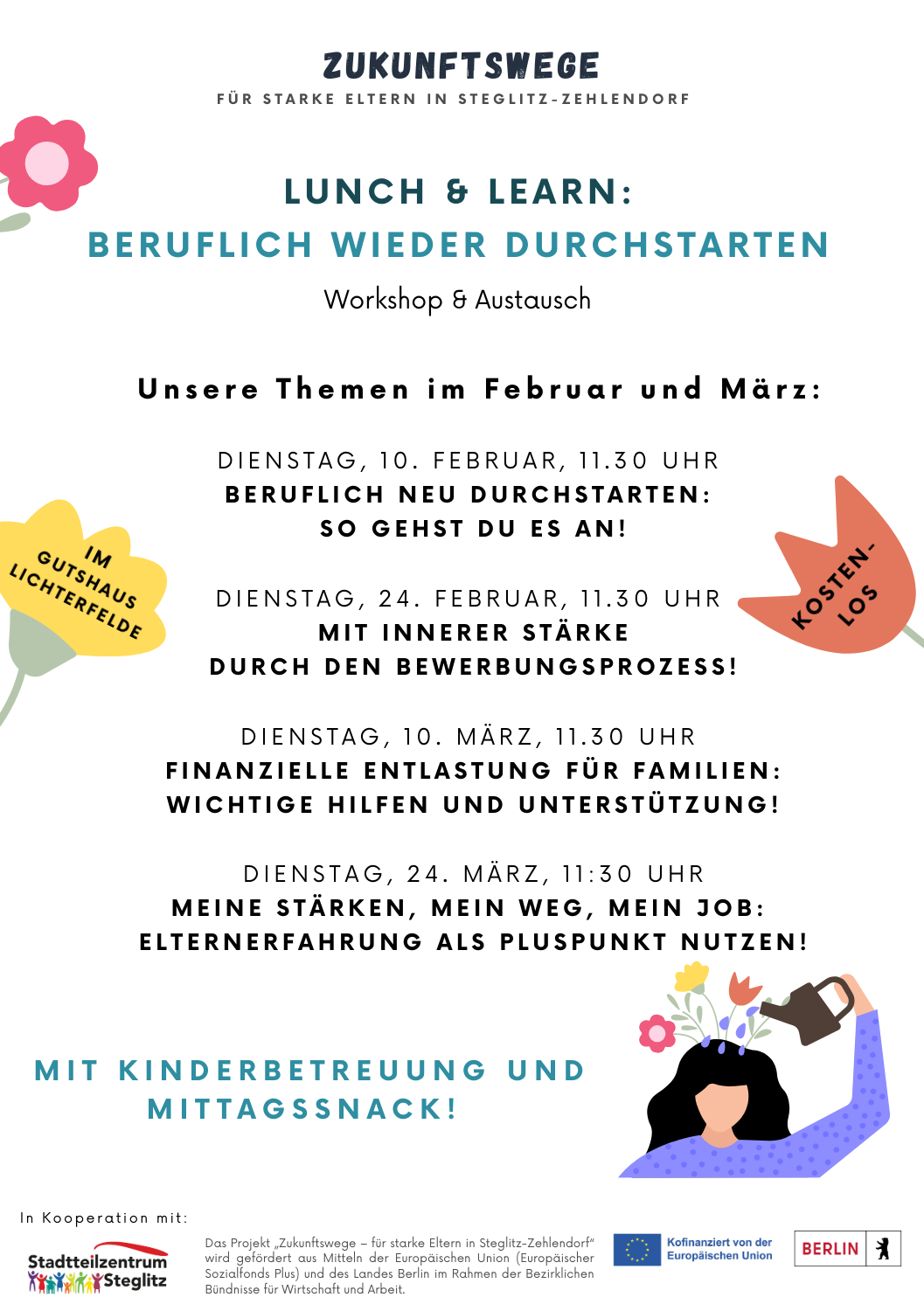 • NEU: Ab Januar 2026 kostenfreies "Lunch & Learn" im Gutshaus Lichterfelde: Infos, Austausch, Mittagessen und Kinderbetreuung. Anmeldung über den Button.
